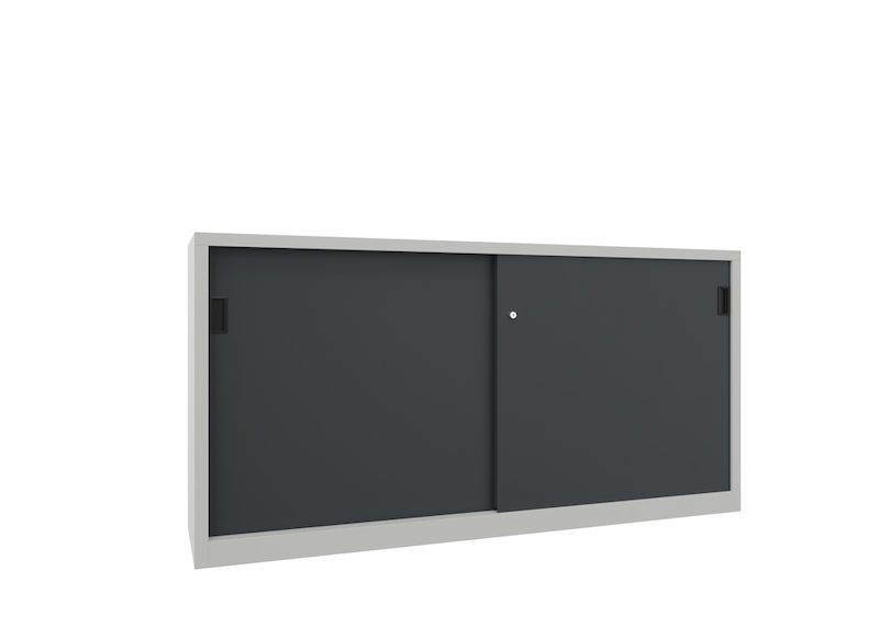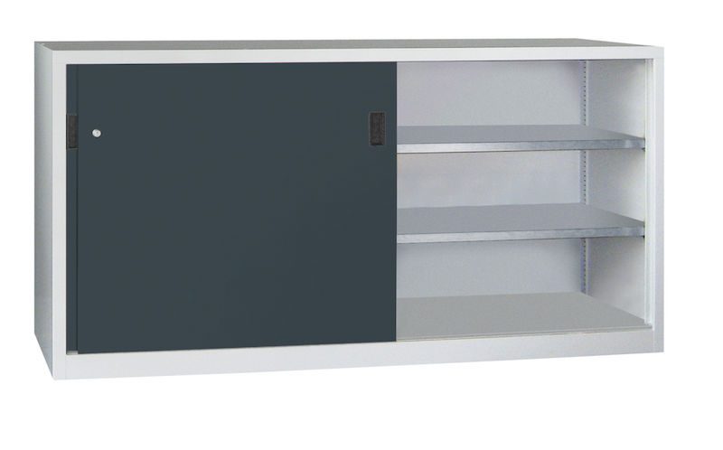 Stålskap med skyvedører Ellinor, høyde 1000 mm, dører i hel platestål, BxD 2000 x 500 mm, med skillevegg og 2 x 2 hylleplater, dør antrasitt.