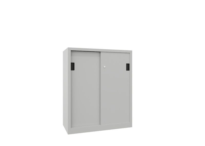 Stålskap med skyvedører Ellinor, høyde 1200 mm, dører i hel platestål, BxD 1000 x 400 mm, med 2 hylleplater, dør lysegrå.