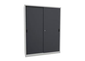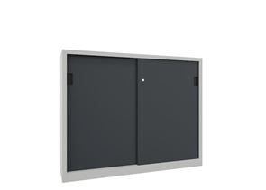 Stålskap med skyvedører Ellinor, høyde 1200 mm, dører i hel platestål, BxD 1500 x 600 mm, med skillevegg og 2 x 2 hylleplater, dør antrasitt.
