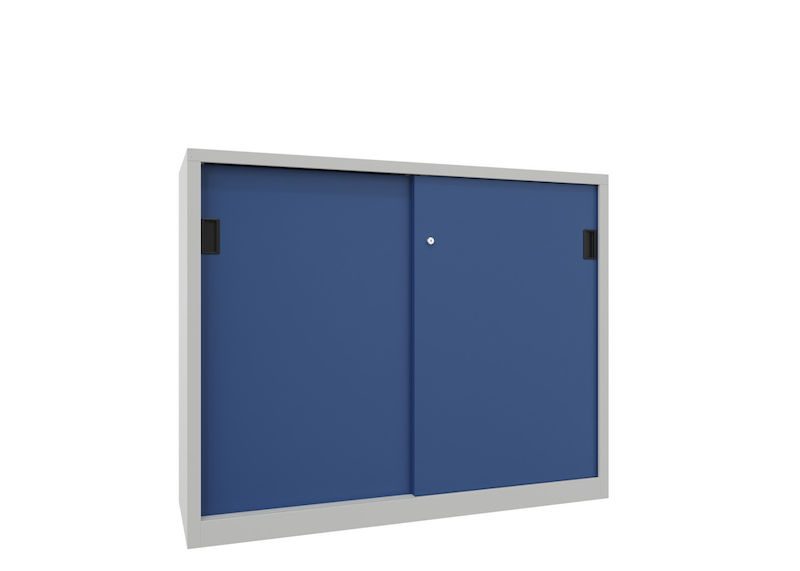 Dette robuste stålskapet overbeviser med sin stabile, sveisede metallkonstruksjon og er spesielt egnet for verksteder, lagerområder og industrielle arbeidsmiljøer med begrenset plass. Den kompakte konstruksjonen med lettbevegelige skyvedører sparer verdifull plass og muliggjør effektiv bruk også i smale ganger eller nisjer.
