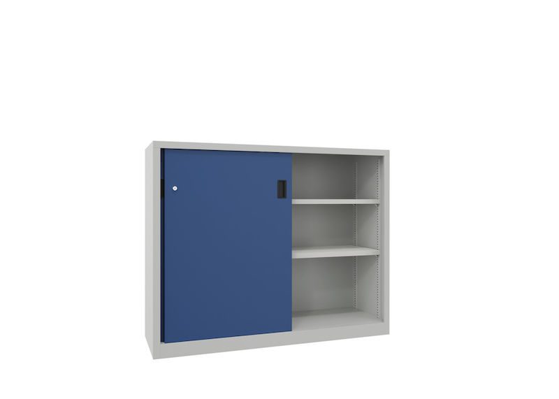 Stålskap med skyvedører Ellinor, høyde 1200 mm, dører i hel platestål, BxD 1500 x 600 mm, med skillevegg og 2 x 2 hylleplater, dør gentianablå. Stålskap med skyvedører – plassbesparende og effektivt