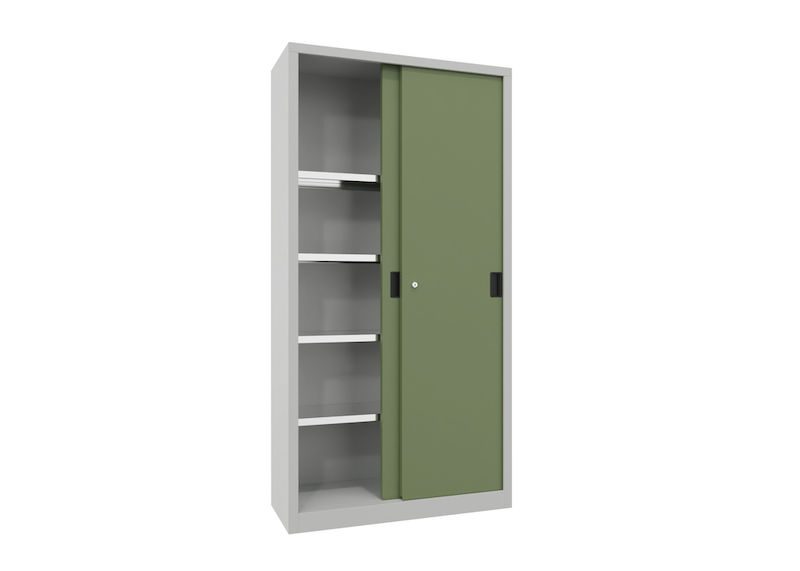 Stålskap med skyvedører Ellinor, høyde 1950 mm, dører i hel platestål, BxD 1000 x 400 mm, med 4 hylleplater, dør resadagrønn. Stålskap med skyvedører – plassbesparende og effektivt