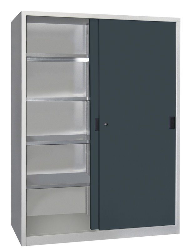 Stålskap med skyvedører Ellinor, høyde 1950 mm, dører i hel platestål, BxD 1500 x 400 mm, med skillevegg og 2 x 4 hylleplater, dør antrasitt.