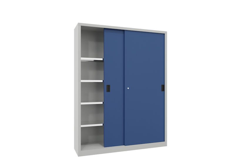 Stålskap med skyvedører Ellinor, høyde 1950 mm, dører i hel platestål, BxD 1500 x 400 mm, med skillevegg og 2 x 4 hylleplater, dør gentianablå. Stålskap med skyvedører – plassbesparende og effektivt