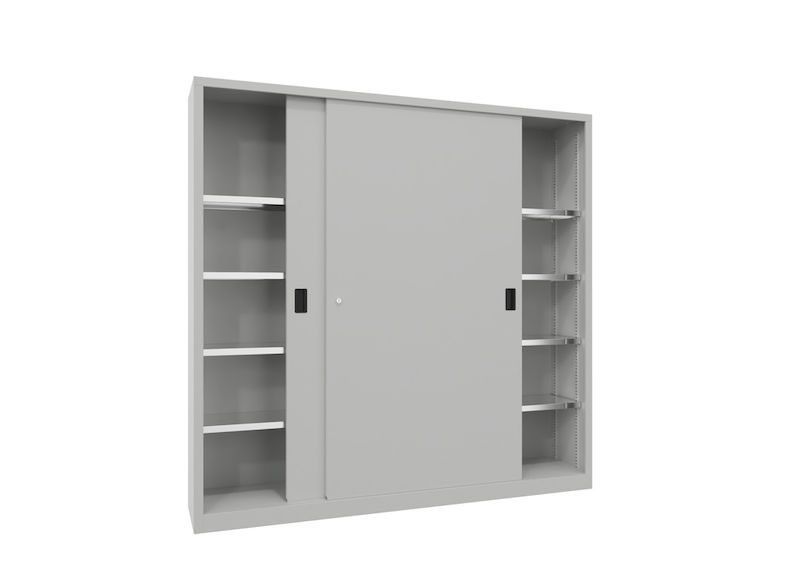 Stålskap med skyvedører Ellinor, høyde 1950 mm, dører i hel platestål, BxD 2000 x 400 mm, med skillevegg og 2 x 4 hylleplater, dør lysegrå. Stålskap med skyvedører – plassbesparende og effektivt