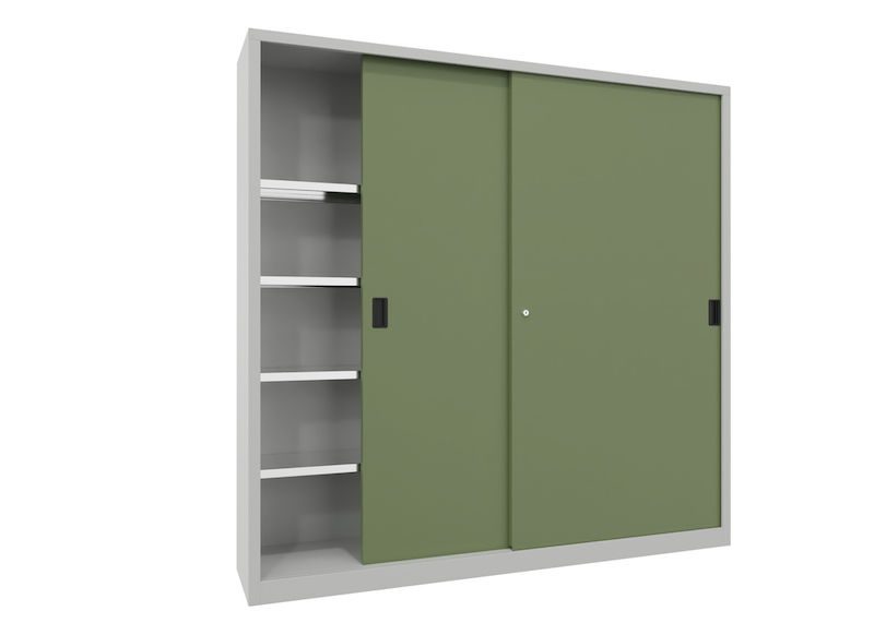 Stålskap med skyvedører Ellinor, høyde 1950 mm, dører i hel platestål, BxD 2000 x 400 mm, med skillevegg og 2 x 4 hylleplater, dør resadagrønn.