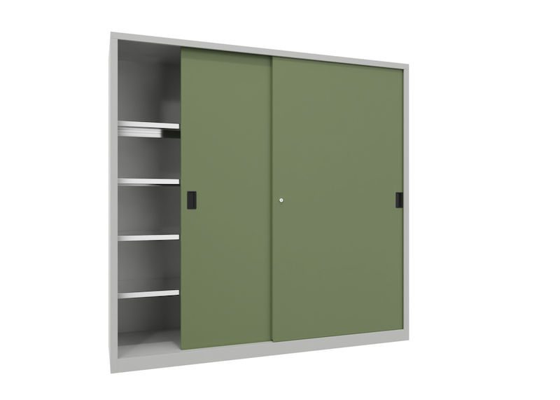 Stålskap med skyvedører Ellinor, høyde 1950 mm, dører i hel platestål, BxD 2000 x 600 mm, med skillevegg og 2 x 4 hylleplater, dør resadagrønn.