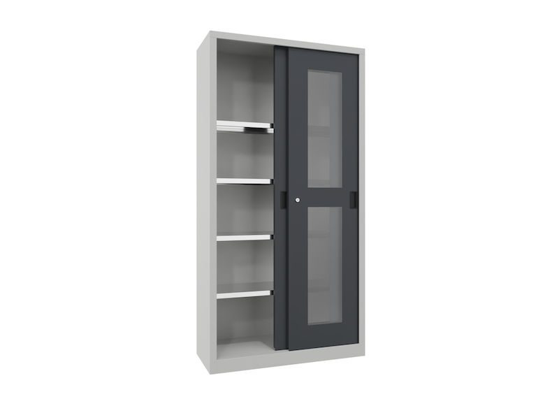 Stålskap med skyvedører Ellinor, høyde 1950 mm, glassdører, BxD 1000 x 400 mm, med 4 hylleplater, dør antrasitt. Stålskap med skyvedører – plassbesparende og effektivt