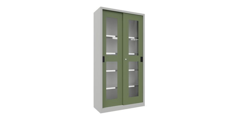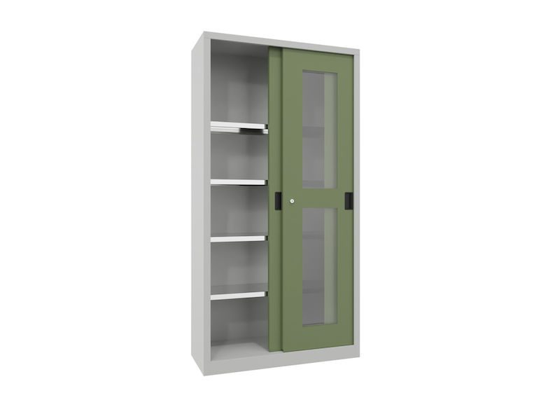 Stålskap med skyvedører Ellinor, høyde 1950 mm, glassdører, BxD 1000 x 400 mm, med 4 hylleplater, dør resadagrønn. Stålskap med skyvedører – plassbesparende og effektivt
