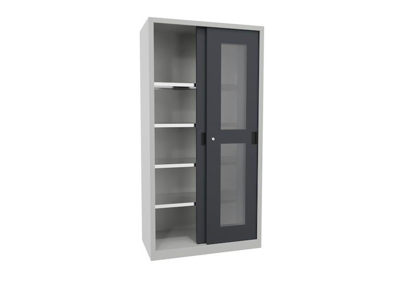 Stålskap med skyvedører Ellinor, høyde 1950 mm, glassdører, BxD 1000 x 500 mm, med 4 hylleplater, dør antrasitt.