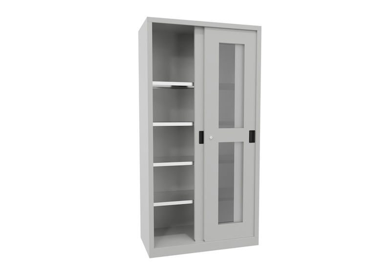 Stålskap med skyvedører Ellinor, høyde 1950 mm, glassdører, BxD 1000 x 500 mm, med 4 hylleplater, dør lysegrå.