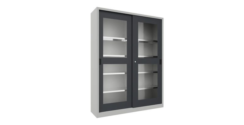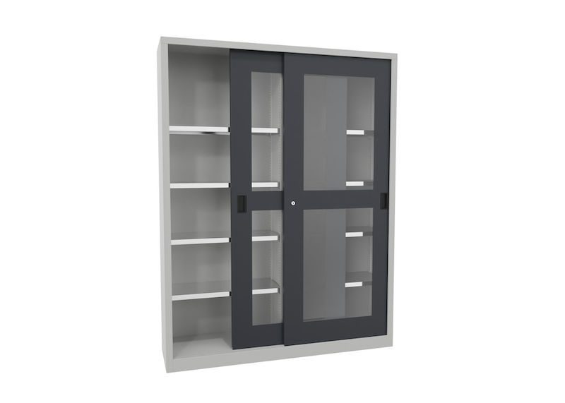 Stålskap med skyvedører Ellinor, høyde 1950 mm, glassdører, BxD 1500 x 400 mm, med skillevegg og 2 x 4 hylleplater, dør antrasitt.