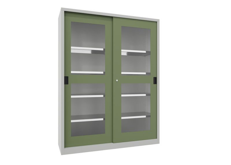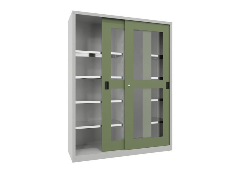 Stålskap med skyvedører Ellinor, høyde 1950 mm, glassdører, BxD 1500 x 500 mm, med skillevegg og 2 x 4 hylleplater, dør resadagrønn. Stålskap med skyvedører – plassbesparende og effektivt