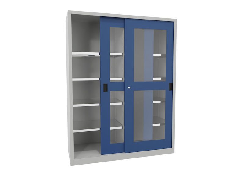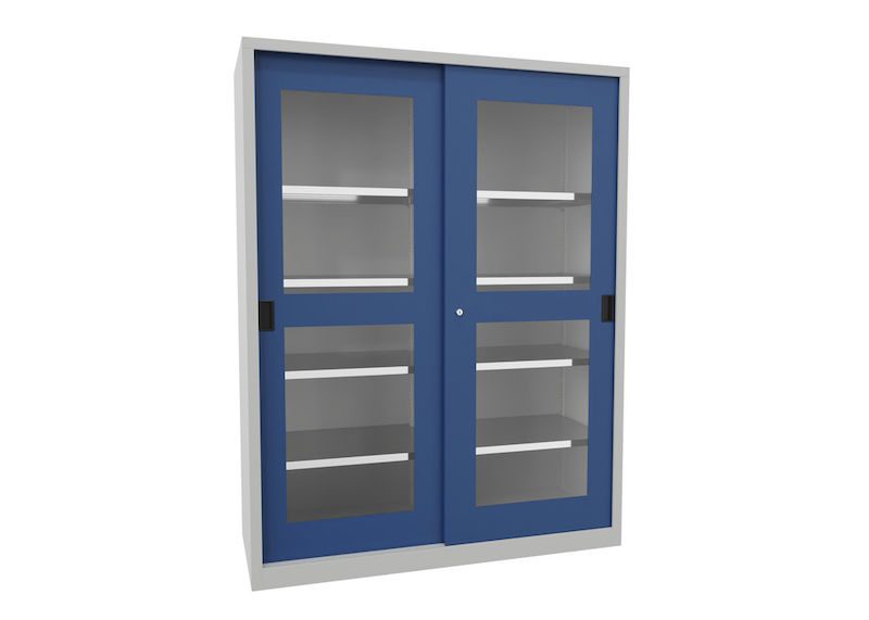 Stålskap med skyvedører Ellinor, høyde 1950 mm, glassdører, BxD 1500 x 600 mm, med skillevegg og 2 x 4 hylleplater, dør gentianablå. Stålskap med skyvedører – plassbesparende og effektivt