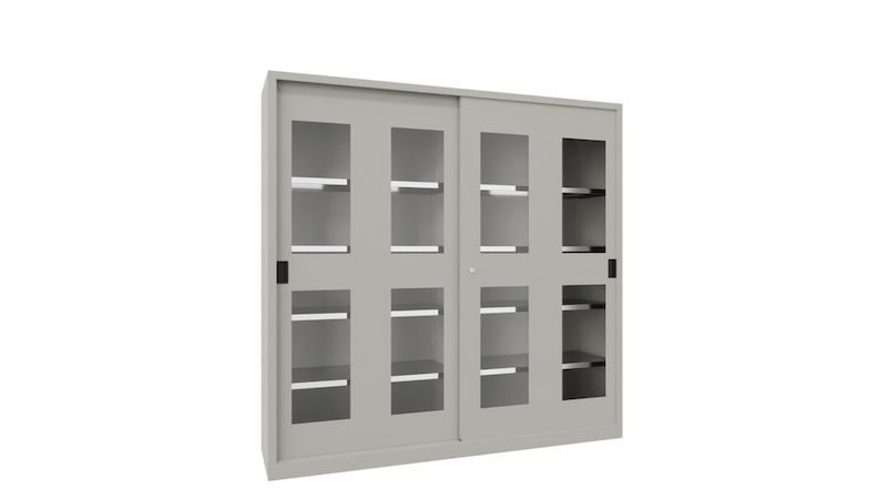 Stålskap med skyvedører Ellinor, høyde 1950 mm, glassdører, BxD 2000 x 400 mm, med skillevegg og 2 x 4 hylleplater, dør lysegrå.