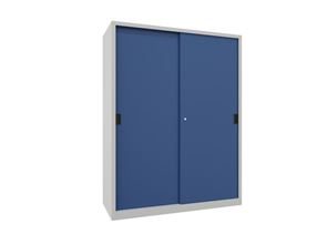 Stålskap med skyvedører, for tung belastning Ellinor, høyde 1200 mm, dører i hel platestål, BxD 1500 x 600 mm, med skillevegg og 2 x 2 hylleplater, dør gentianablå.