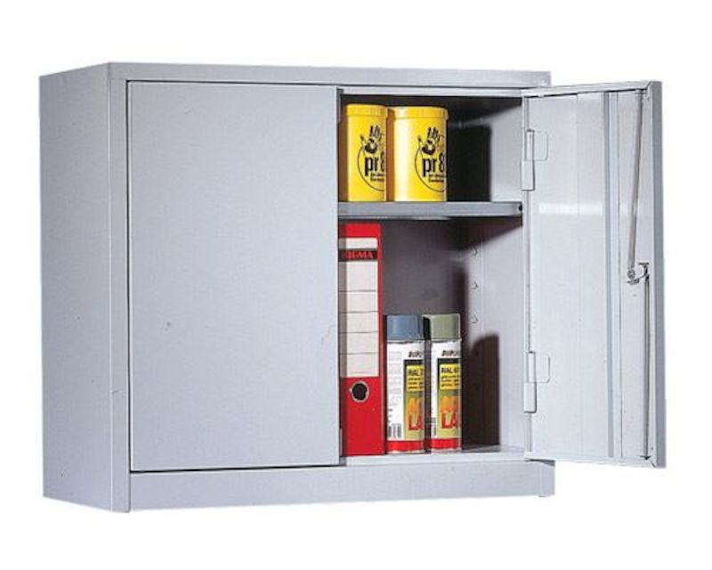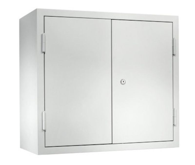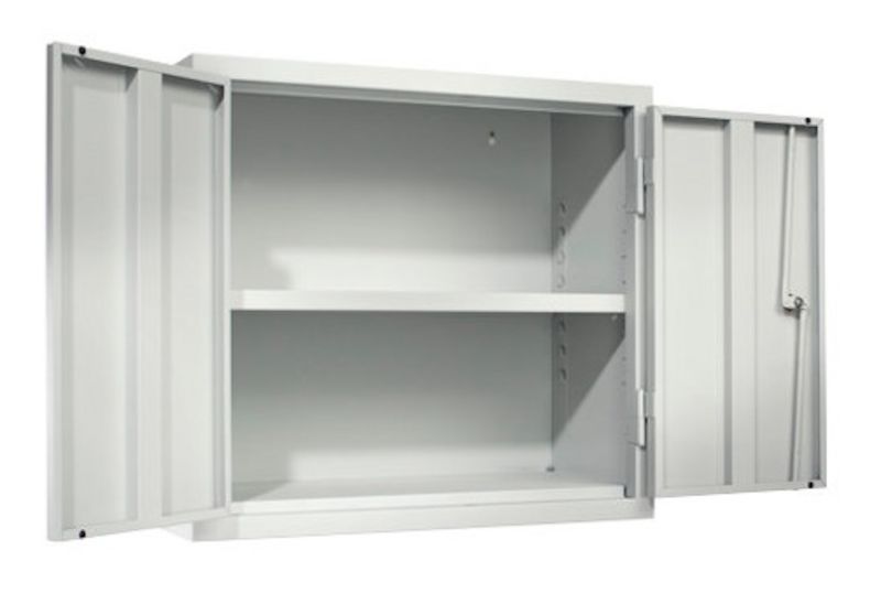 Verkstedskap, vegghengt, 1 hylle, BxDxH 650x320x600 mm, lysegrå. Stålplatekonstruksjon med pardører, låsbar med sylinderlås. 1 hylleplate, innstillbar i høyden i 50-mm trinn. Hull i bakveggen for veggfeste. Høyverdig brennlakkering.