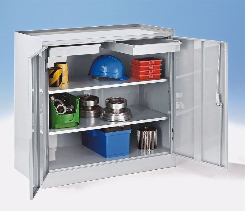 Verktøyskap, 2 skuffer, 2–4 hyller, B 1000 mm. HxBxD 1000x1000x500 mm. Finnes i flere farger. Mange bruksområder i verksted, lager og industri. Pulverlakkert stålplatekonstruksjon. Skuffer lakkert i skapfarge, 2/3 uttrekkbare. Galvaniserte hylleplater, med intervall 25 eller 30 mm. Med eller uten skillevegg. Lastekapasitet ca. 35 kg per hylle.