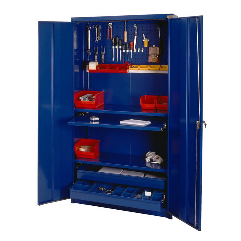 Verktøyskap Rex, pakke 1, HxBxD 1975x1000x500 mm, blå, elektromekanisk sikkerhetshåndtak. Kraftig verktøyskap i helsveiset stål med 2 perforerte verktøypaneler, 2 faste hylleplater, 2 uttrekkbare skuffer. Skuffene løper lett på skinner med kulelager som tåler tøff håndtering. 90 kg per hylleplate.