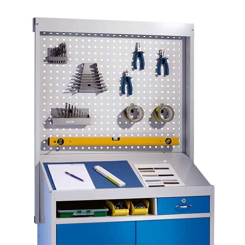 Verktøytavle til verktøyskap med skrivepult, perforert tavle, HxBxD 780 x 915 x 30 mm. For verktøylagring med aktuelle holdere. Kan bare monteres i forbindelse med pultskap.