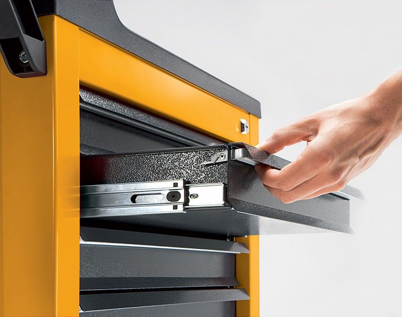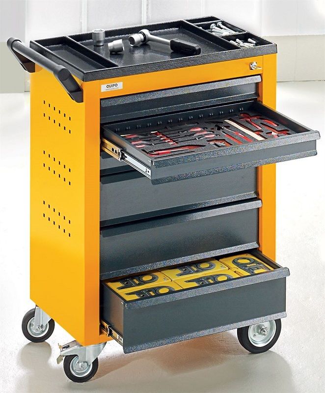 Verktøyvogn, 6 skuffer med skuffesperre, HxBxD 930x630x410 mm, blå. Høyverdig profesjonell verktøyvogn med svært godt pris-/ytelsesforhold. Seks skuffer med skuffesperrer. Stabil, pulverlakkert stålplatekonstruksjon. Arbeidsflate av slagfast plast med smådelsoppbevaring. 100% uttrekkbare skuffer med kulelager, individuell uttrekkslåsing til beskyttelse mot utilsiktet åpning. Separat låsing av hver skuff med praktisk énhåndssystem. Lastekapasitet per skuff ca. 25 kg. Sentrallås med sylinderlås. Innvendige mål bredde x dybde 490 x 340 mm. 2 løpehjul, ø 140 mm og 2 svingbare hjul med bremser, ø 100 mm. Inkludert 5 skuffeskilleplater, høyde 75 mm.