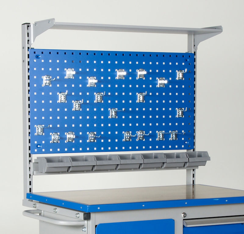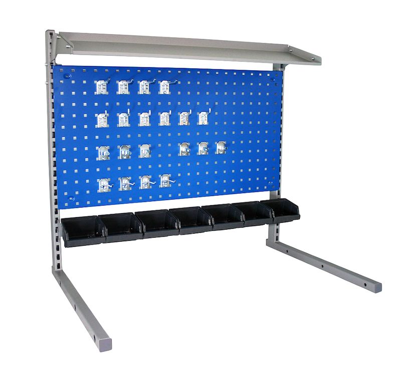 Pakken inneholder: Konsollsøyle, skinne med beholdere, verktøytavle, kroksett og metallhylle.