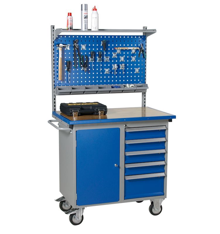 Kompletter med en påbyggingspakke som inneholder: Konsollsøyle, skinne med beholdere, verktøytavle, kroksett og metallhylle 870x200 mm.